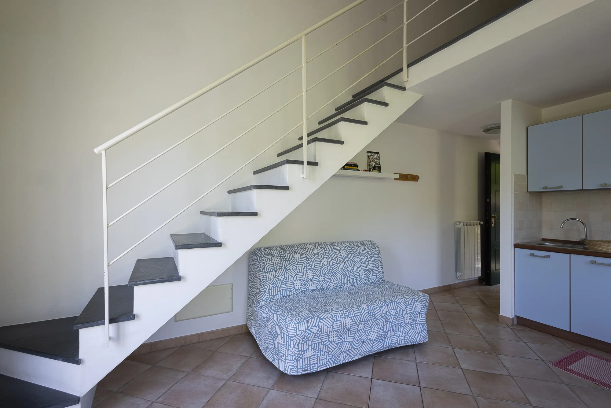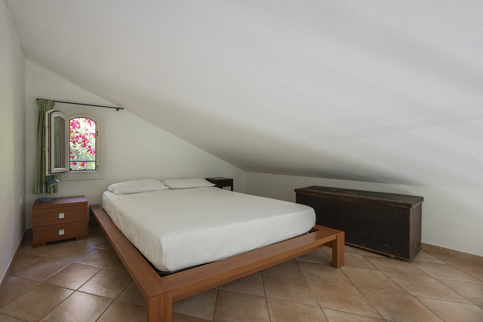 Mansarda nord della casa con ampio living, tavolo, cucina attrezzata e divano letto. Al piano superiore letto matrimoniale. Bagno con doccia.