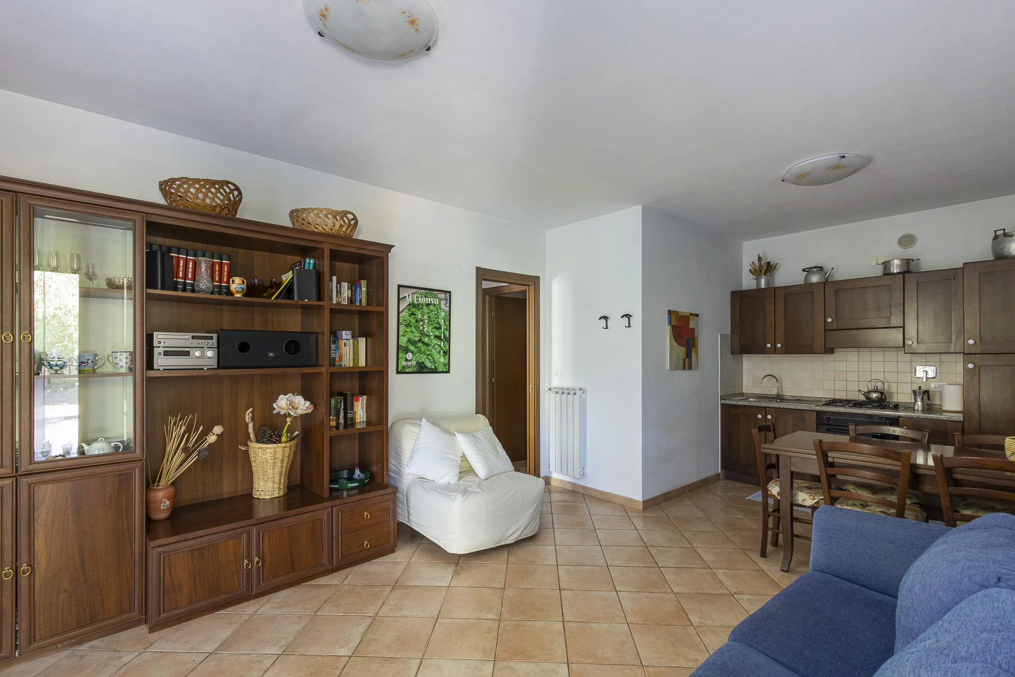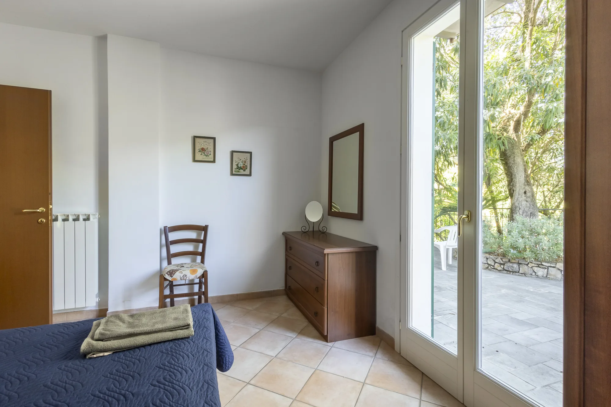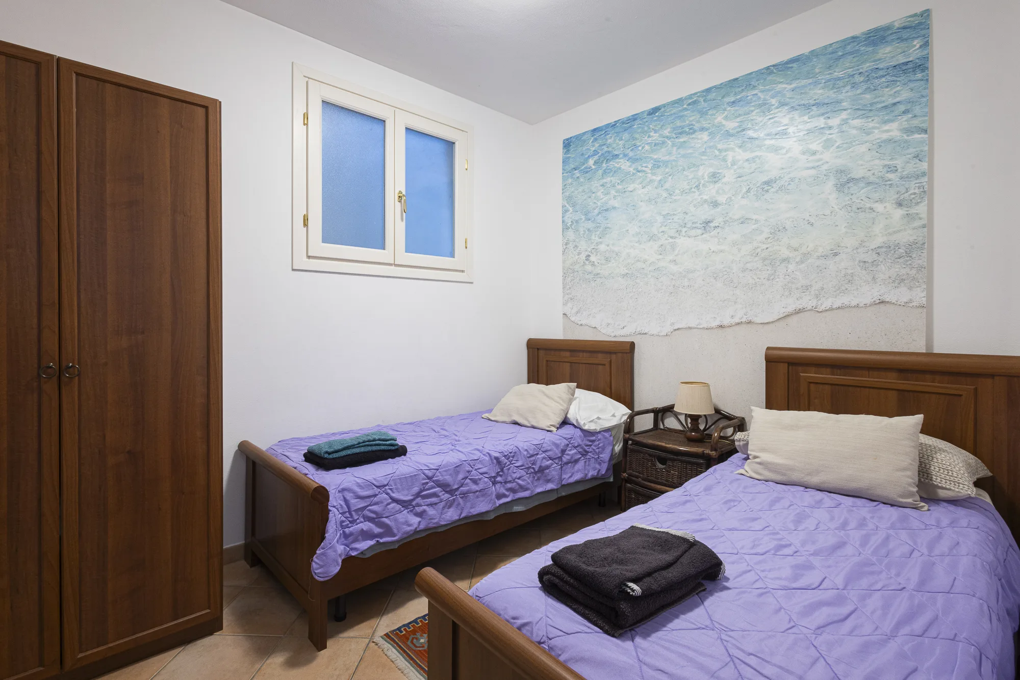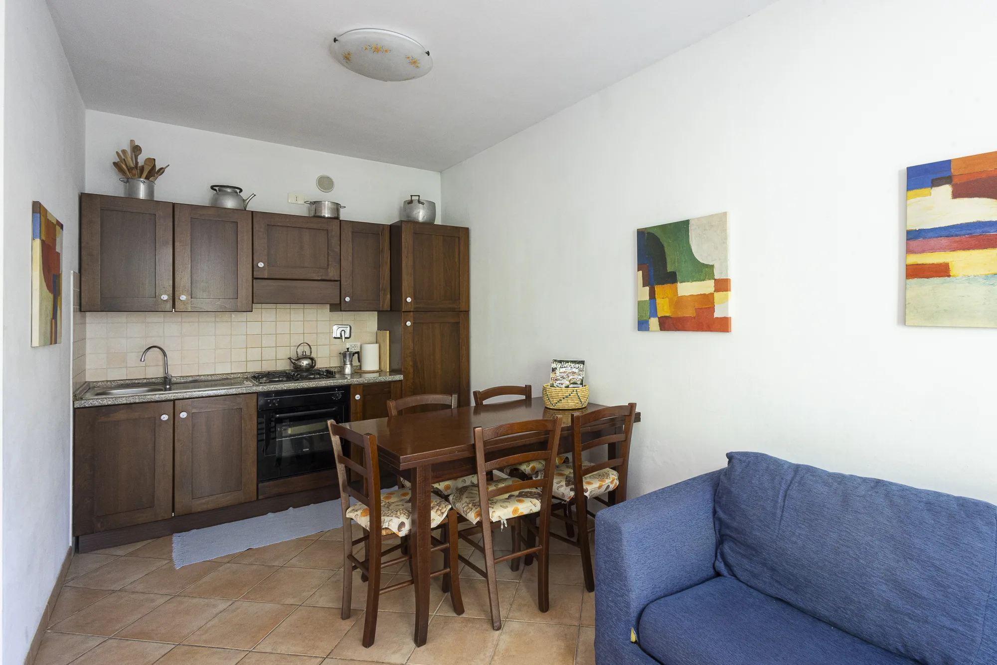Appartamento al piano terra della casa con 1 camera matrimoniale, 1 camera con 2 letti singoli, bagno con doccia, cucina attrezzata, living con divano, poltrona letto e tavolo da pranzo.