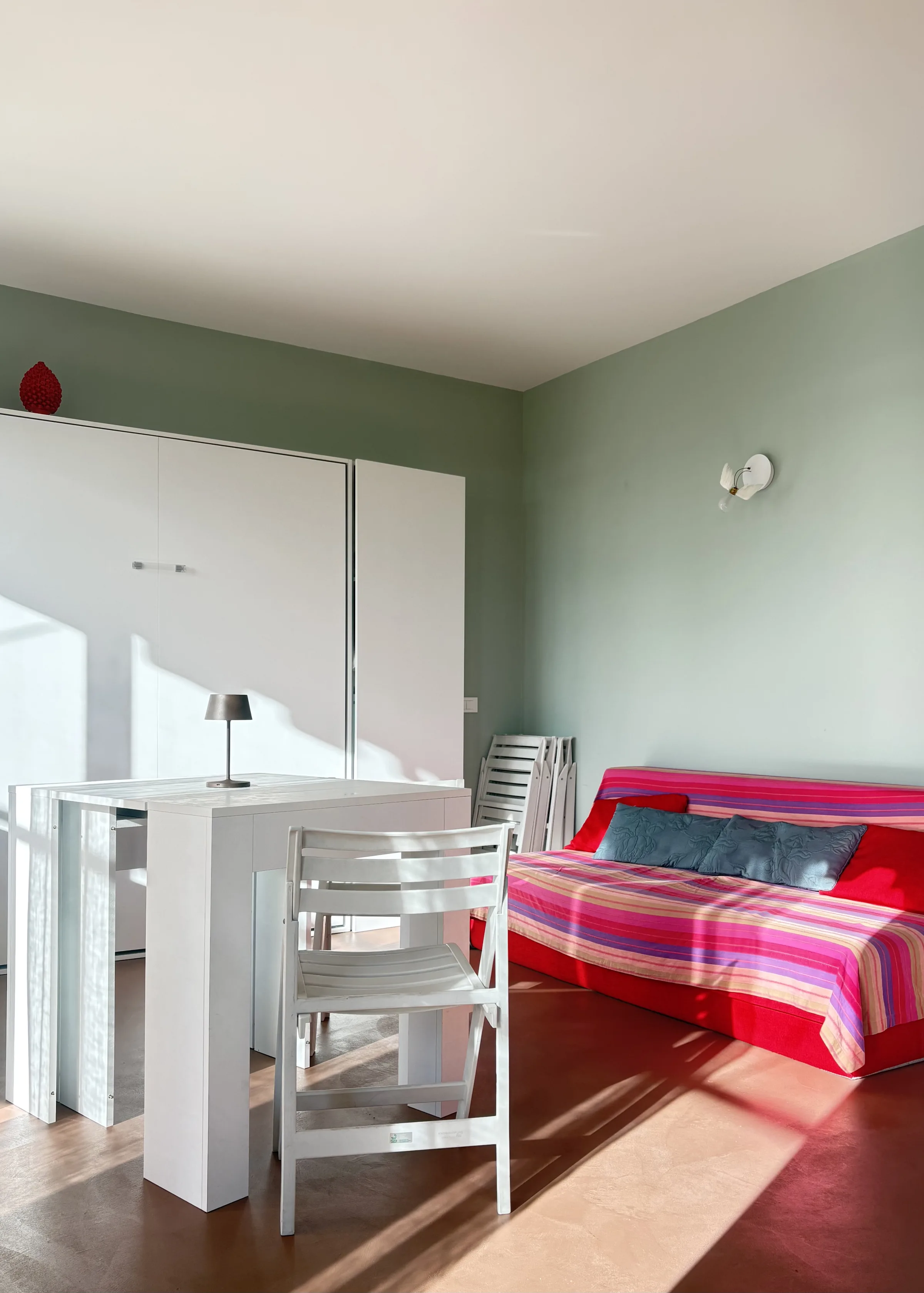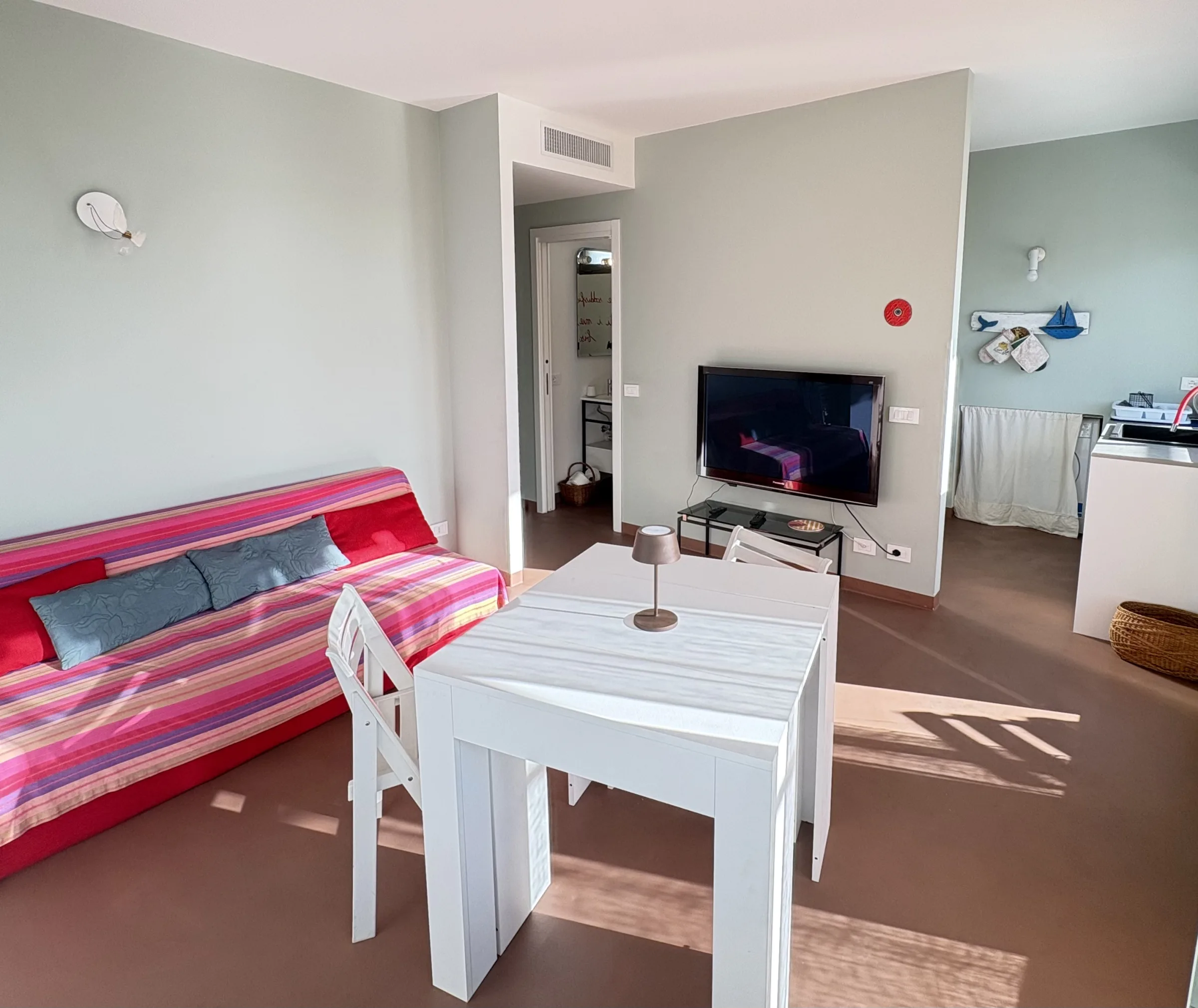 La soluzione perfetta per vivere il mare d'inverno. Appartamento al primo piano con 1 camera matrimoniale, un soggiorno con letto matrimoniale a scomparsa, divano, cucina, living e 2 bagni completi.